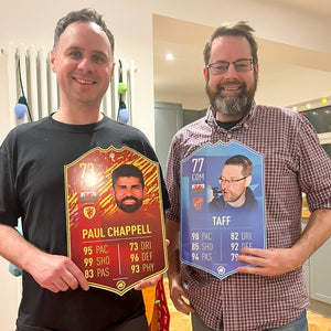 My brother-in-law was over the moon it! The moment he saw himself depicted as a 6ft 4” out-of-position striker with a pace rating of 3 for Wales, he burst into laughter. We would've shared a video, but his colorful language would have required a lot of muting 😂. The quality, even without the metal backing, exceeded expectations, and we're so glad we opted for the larger size. It turned out absolutely perfect, and the supplier's communication leading up to the Christmas rush was top-notch! 👏