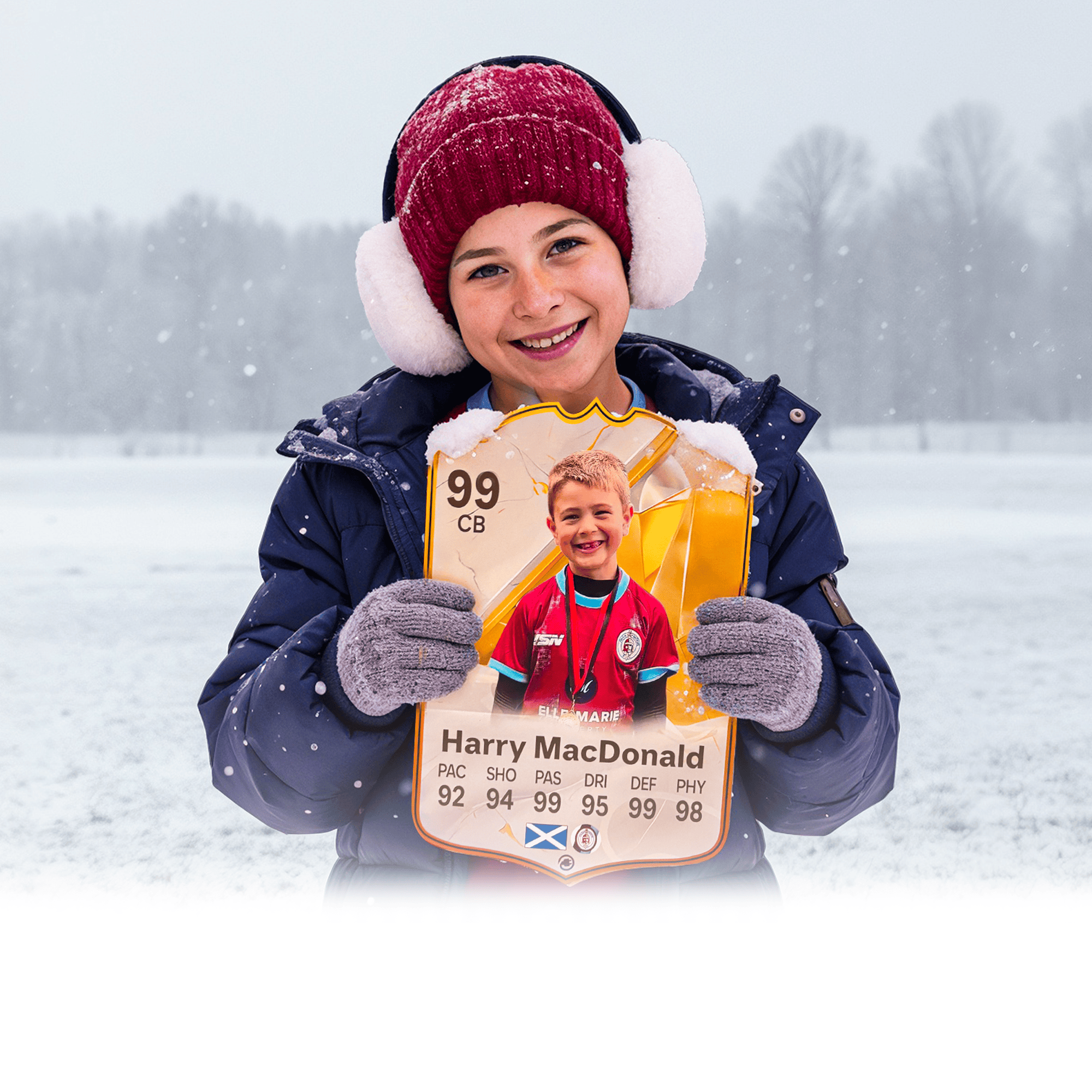 When it comes to personalising your card, the basic steps are to upload a photo and add a name to your card. Then you’ll add details like your player’s position and skill ratings out of 99 for each football skill shown on the card. Our online card builder makes this really easy. And if you aren’t a football card expert, don’t worry!