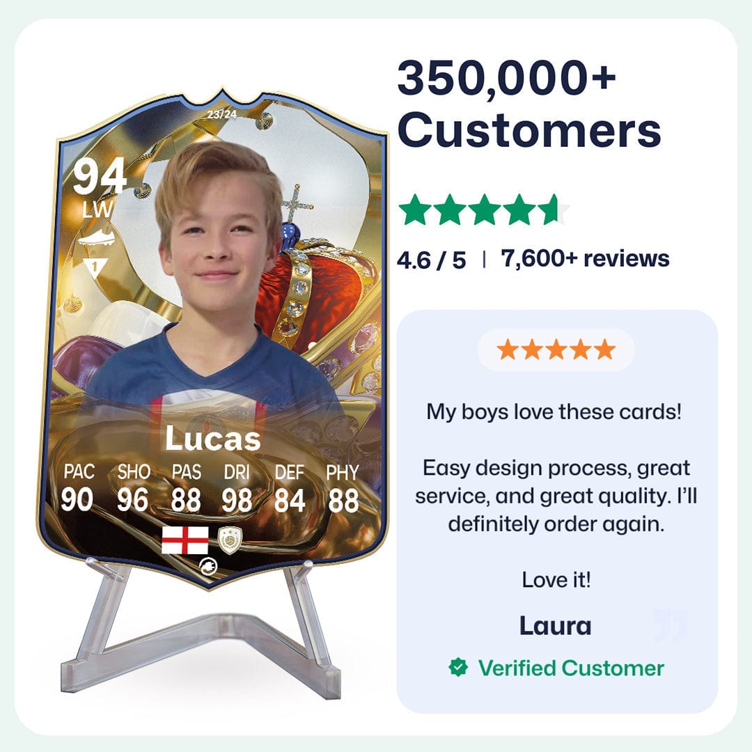 Once you’ve personalised your card, our design experts will edit your photo, design your card, and bring it to life in stunning quality. You’ll get a full preview before we print your card and every card’s quality is backed by our Gold Standard Guarantee. So far, over 350,000+ football fans agree: A CardsPlug football card is the ultimate football gift!