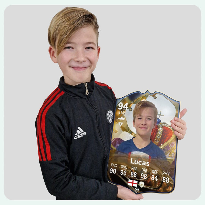 When it comes to personalising your card, the basic steps are to upload a photo and add a name to your card. Then you’ll add details like your player’s position and skill ratings out of 99 for each football skill shown on the card. Our online card builder makes this really easy. And if you aren’t a football card expert, don’t worry!