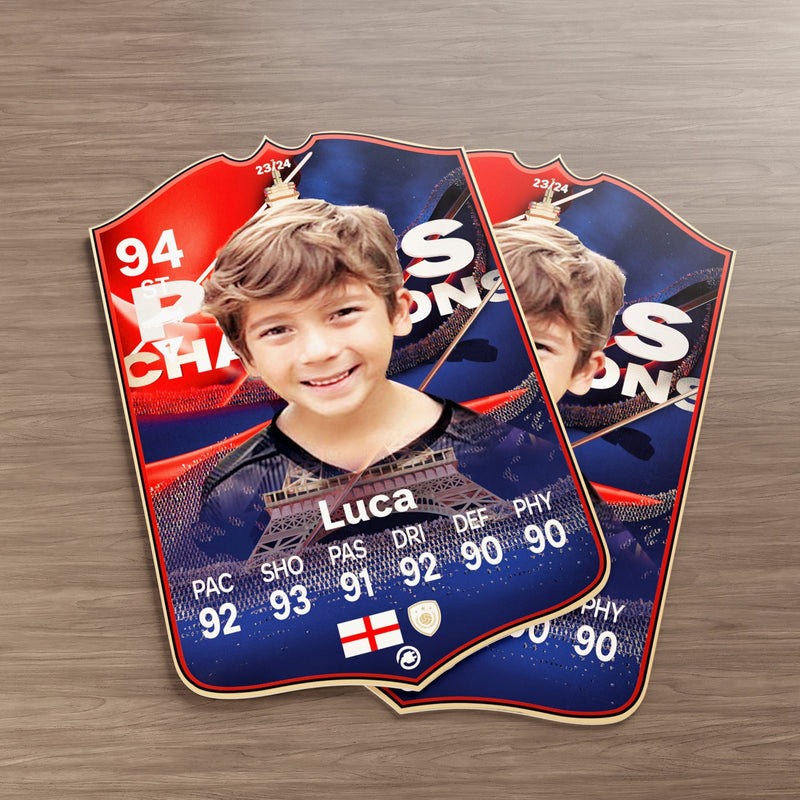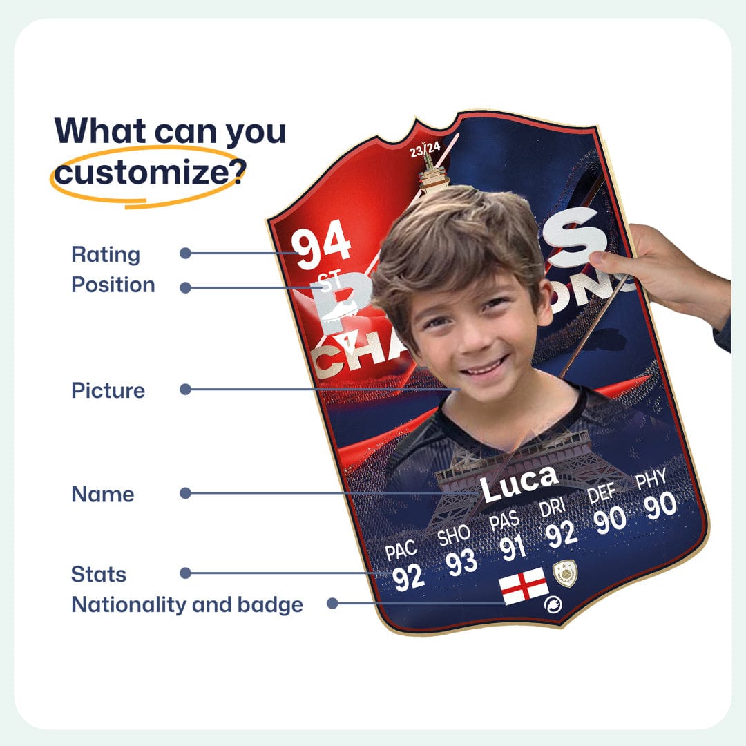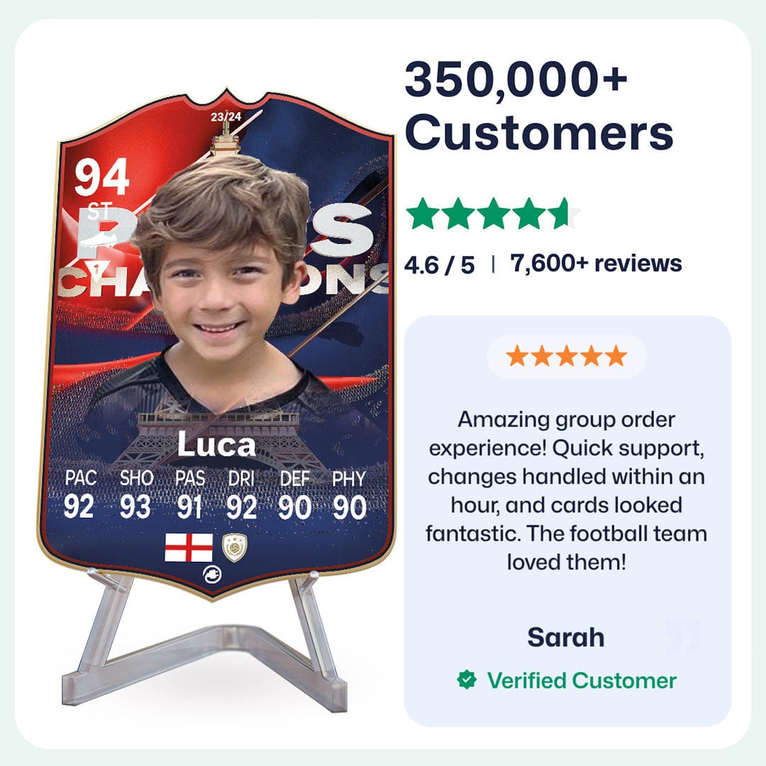 Yes! Our football card designers will remove the background from the photo you upload so it looks just like the football cards you might’ve seen games like EA FC 25, EA FC 24 or FIFA. We’ll also position the photo perfectly on the football card so it looks great. If there are any problems with the quality of your photo, we’ll reach out and let you know. Plus, our website's AI will remove the background on the image for visual purposes before purchase so you can see it without a background on the card.