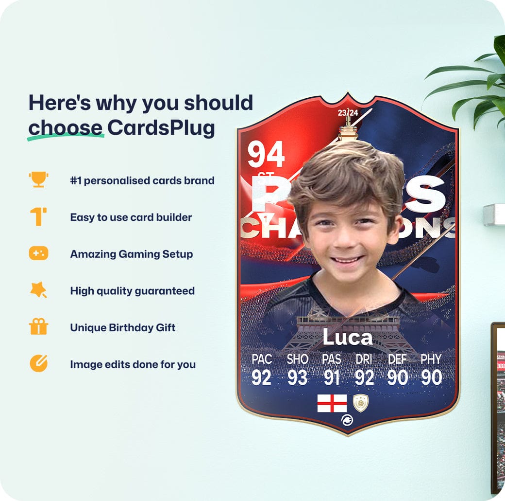 CardsPlug is home to the world’s favourite personalised football cards. Our easy football card builder lets you make a real life football card with your own name, photo, and skill ratings. With 100+ designs to choose from and some inspired by EA SPORTS FC 26 cards seen in EA FC 26, EA FC 25 and FC 24 as well as FIFA cards seen in games like FIFA 23 and FIFA 22.