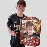 Our football card builder lets you choose between two different card materials. Our Standard cards are made of a ultra-strong variety of Foamex (not cardboard or foam!). This material has a lovely gloss finish and is also super durable. Our world-exclusive Metal football cards have a matte finish and are slightly heavier. Both look amazing and will last forever.