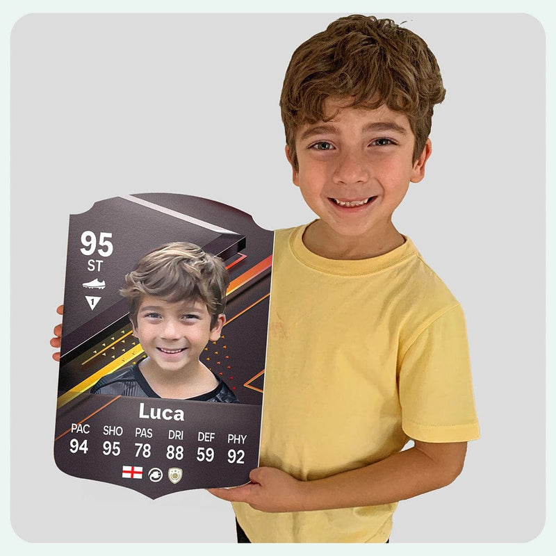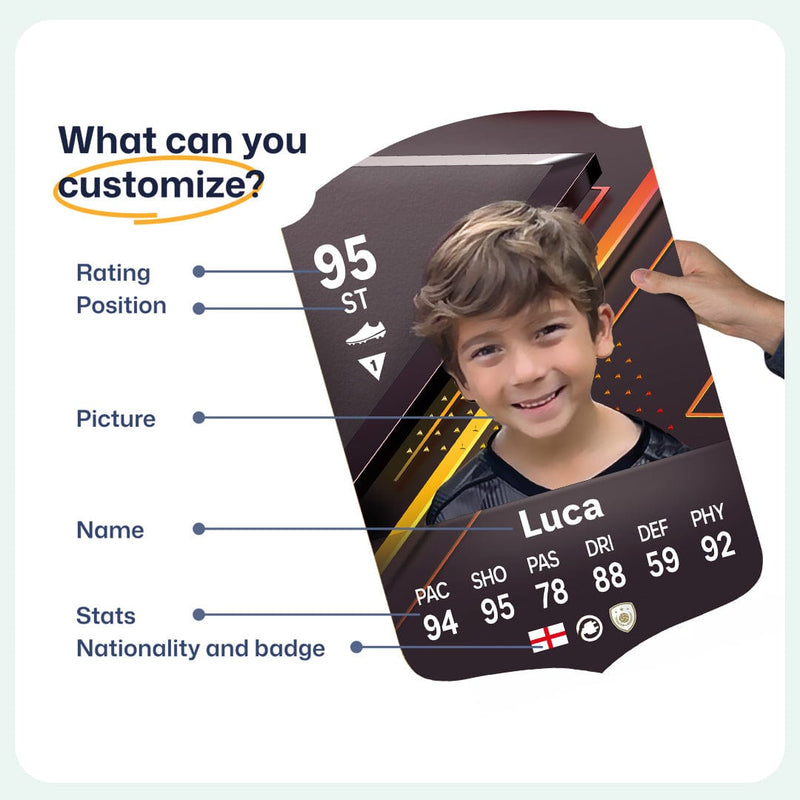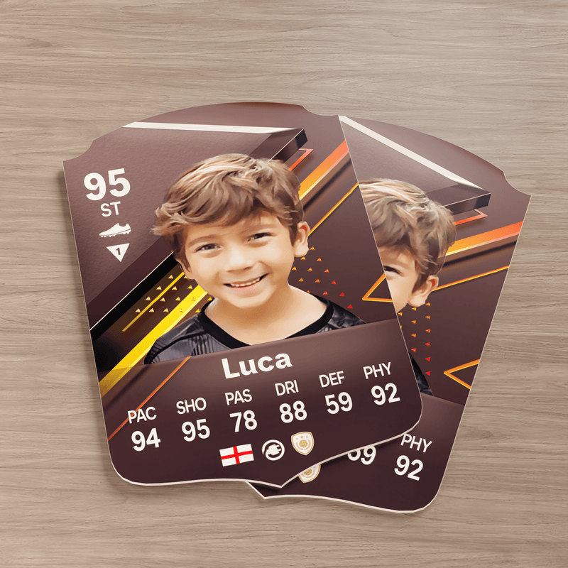 When it comes to personalising your card, the basic steps are to upload a photo and add a name to your card. Then you’ll add details like your player’s position and skill ratings out of 99 for each football skill shown on the card. Our online card builder makes this really easy. And if you aren’t a football card expert, don’t worry!