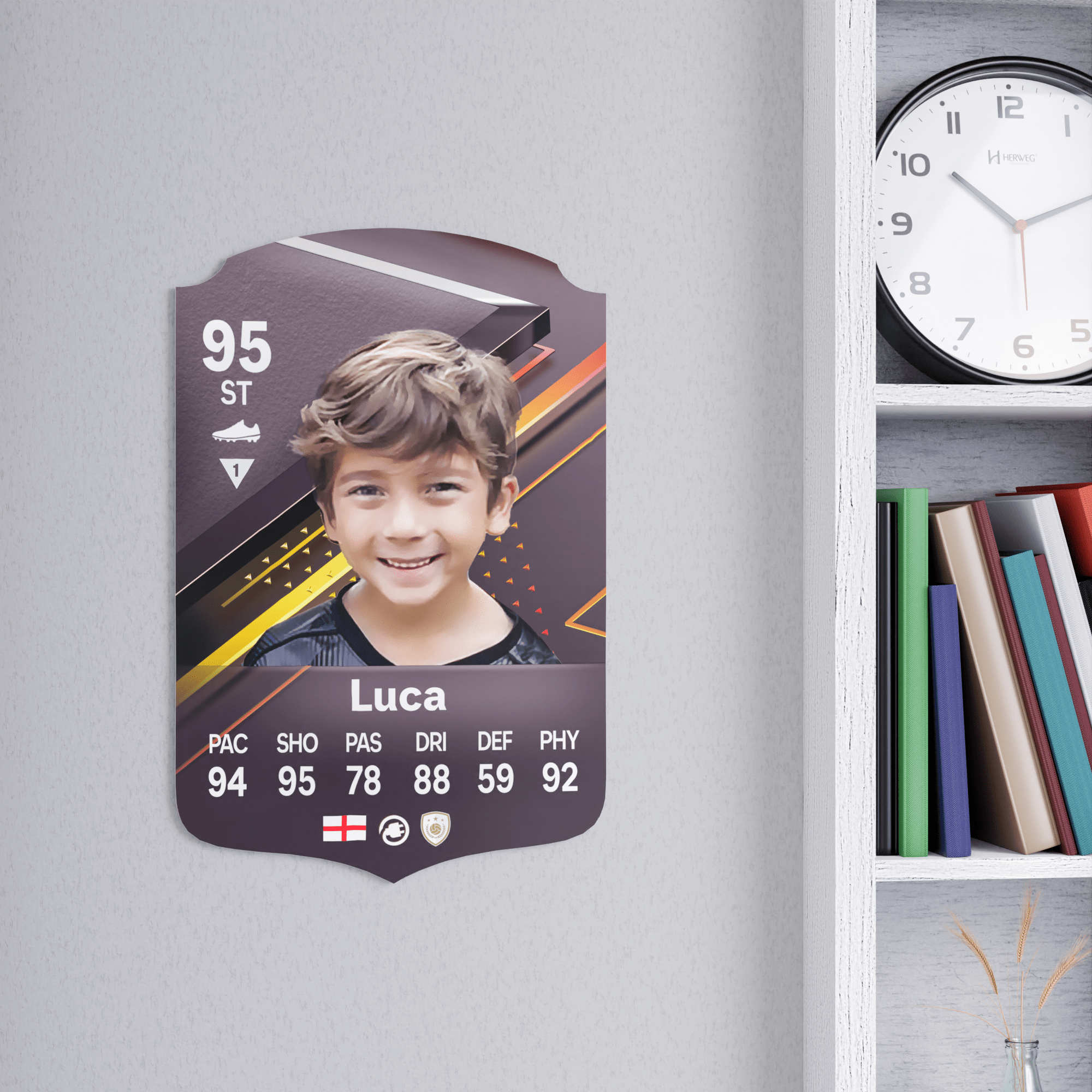 Our football card builder lets you choose between two different card materials. Our Standard cards are made of a ultra-strong variety of Foamex (not cardboard or foam!). This material has a lovely gloss finish and is also super durable. Our world-exclusive Metal football cards have a matte finish and are slightly heavier. Both look amazing and will last forever.