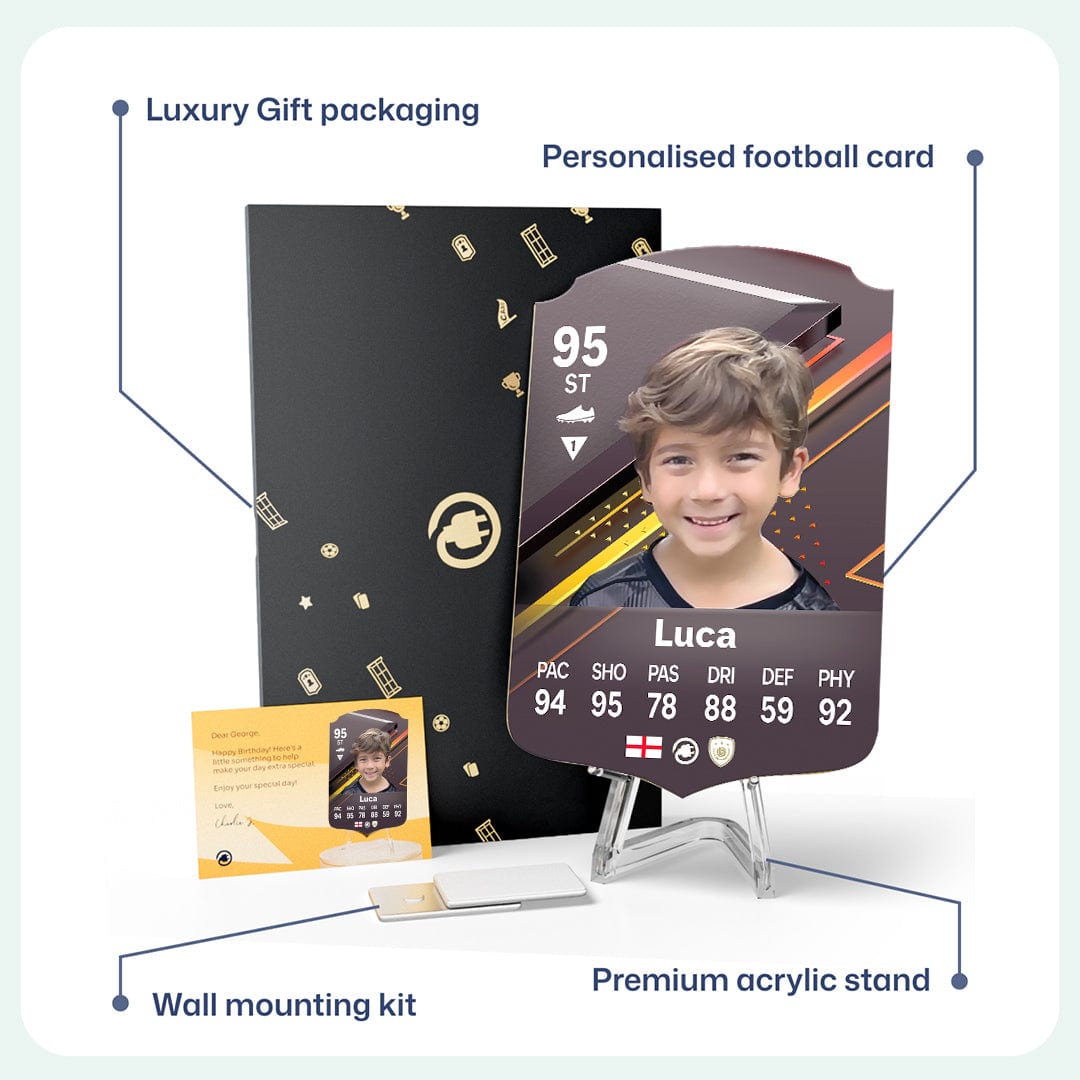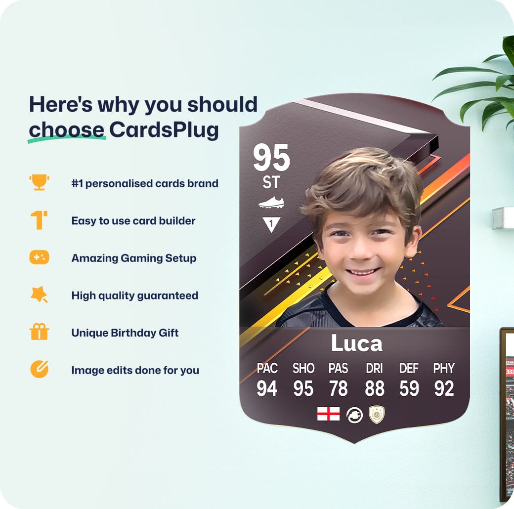 CardsPlug is home to the world’s favourite personalised football cards. Our easy football card builder lets you make a real life football card with your own name, photo, and skill ratings. With 100+ designs to choose from and some inspired by EA SPORTS FC 26 cards seen in EA FC 26, EA FC 25 and FC 24 as well as FIFA cards seen in games like FIFA 23 and FIFA 22.