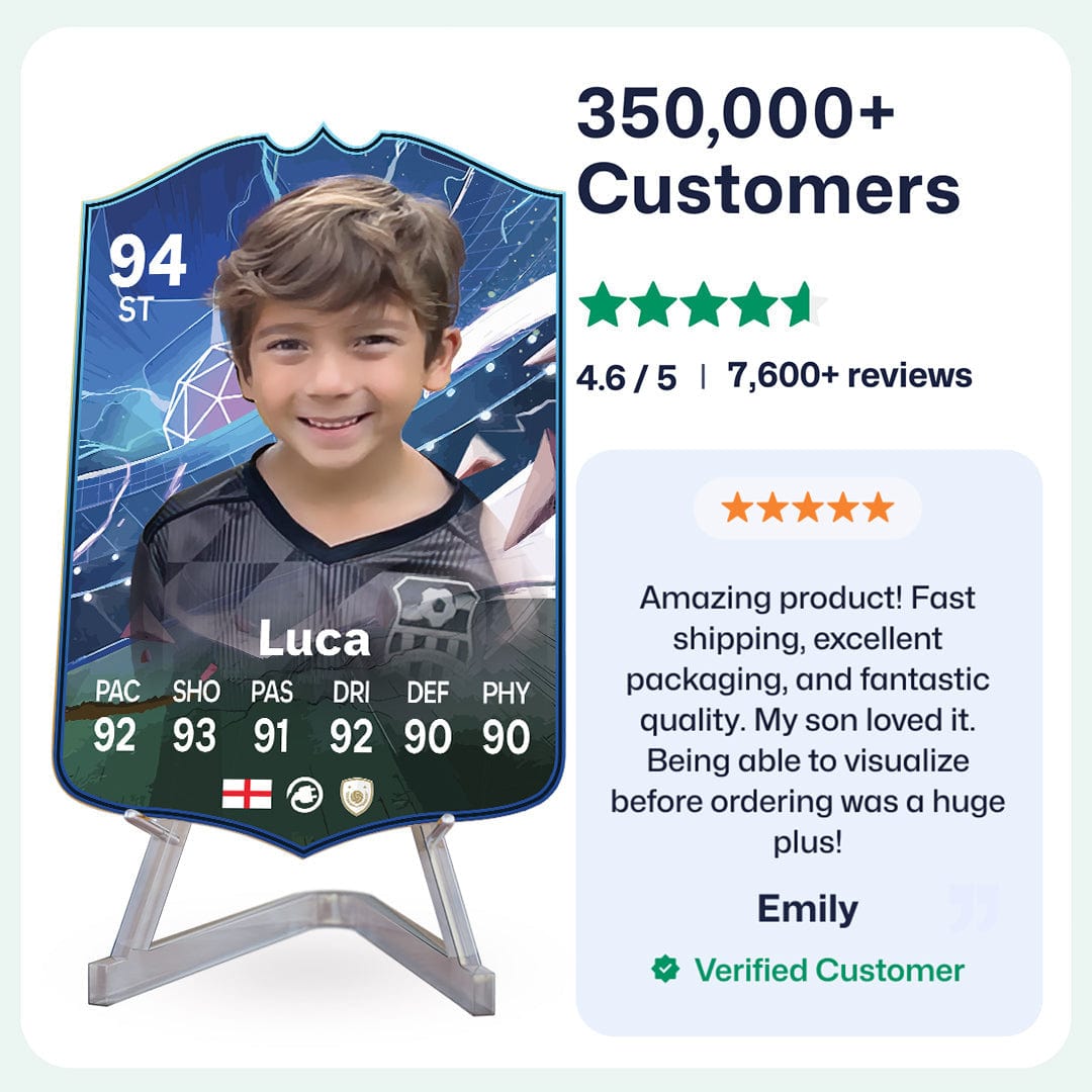 Yes! Our football card designers will remove the background from the photo you upload so it looks just like the football cards you might’ve seen games like EA FC 25, EA FC 24 or FIFA. We’ll also position the photo perfectly on the football card so it looks great. If there are any problems with the quality of your photo, we’ll reach out and let you know. Plus, our website's AI will remove the background on the image for visual purposes before purchase so you can see it without a background on the card.