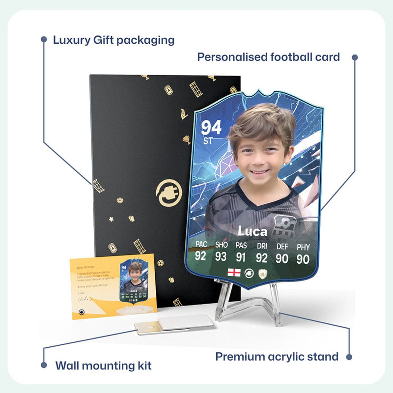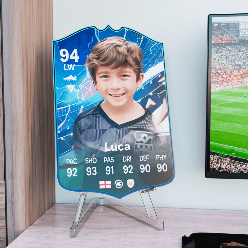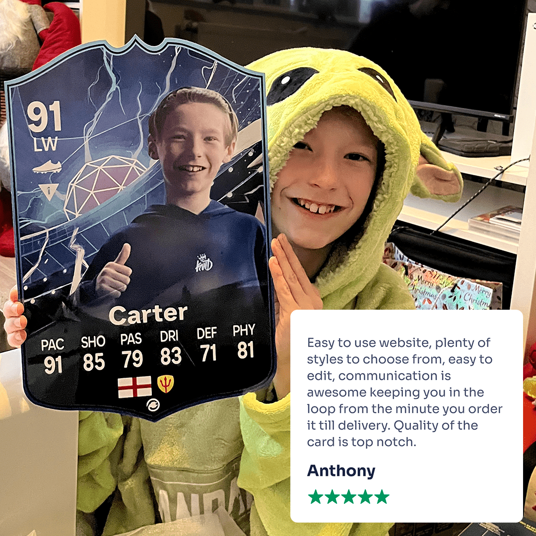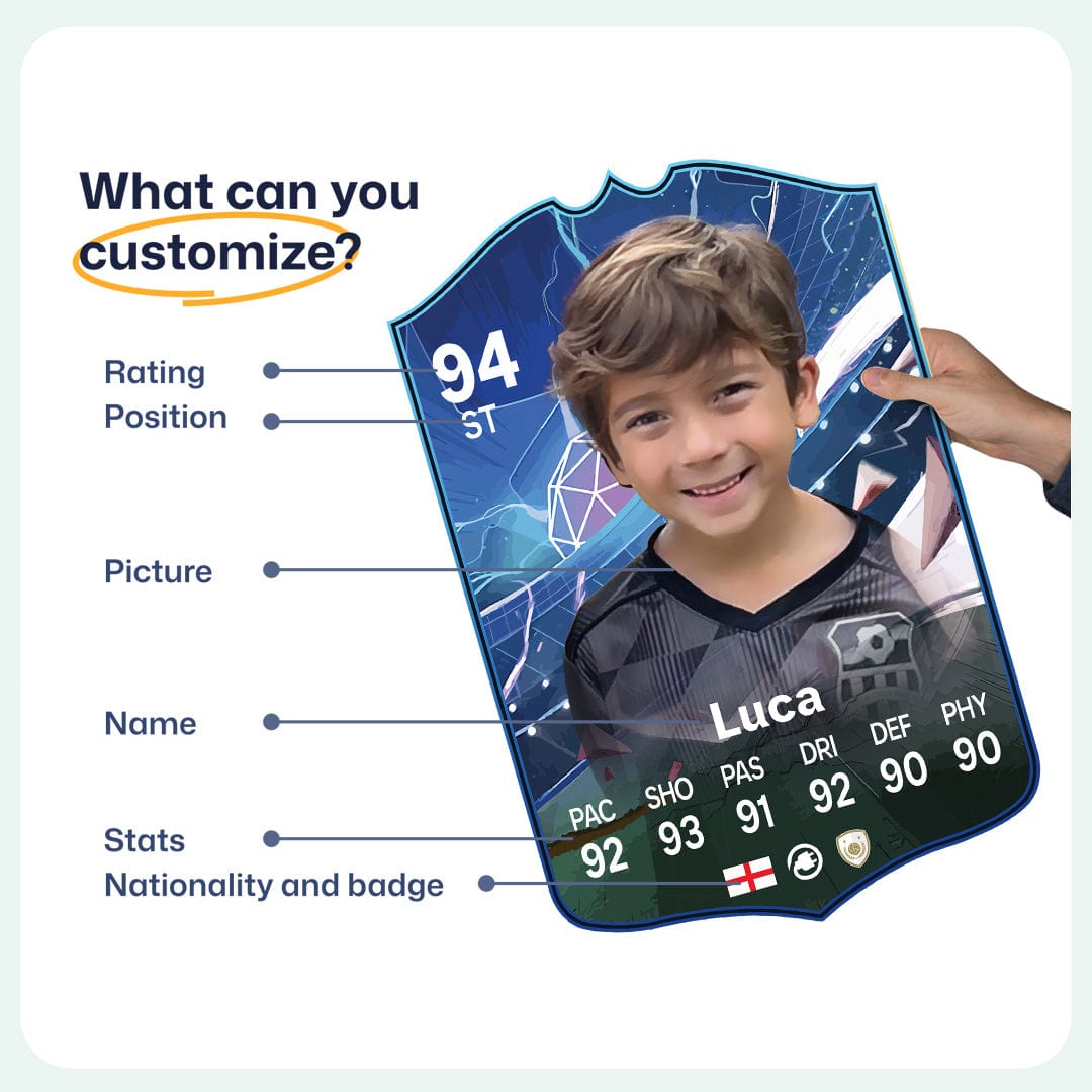 When it comes to personalising your card, the basic steps are to upload a photo and add a name to your card. Then you’ll add details like your player’s position and skill ratings out of 99 for each football skill shown on the card. Our online card builder makes this really easy. And if you aren’t a football card expert, don’t worry!
