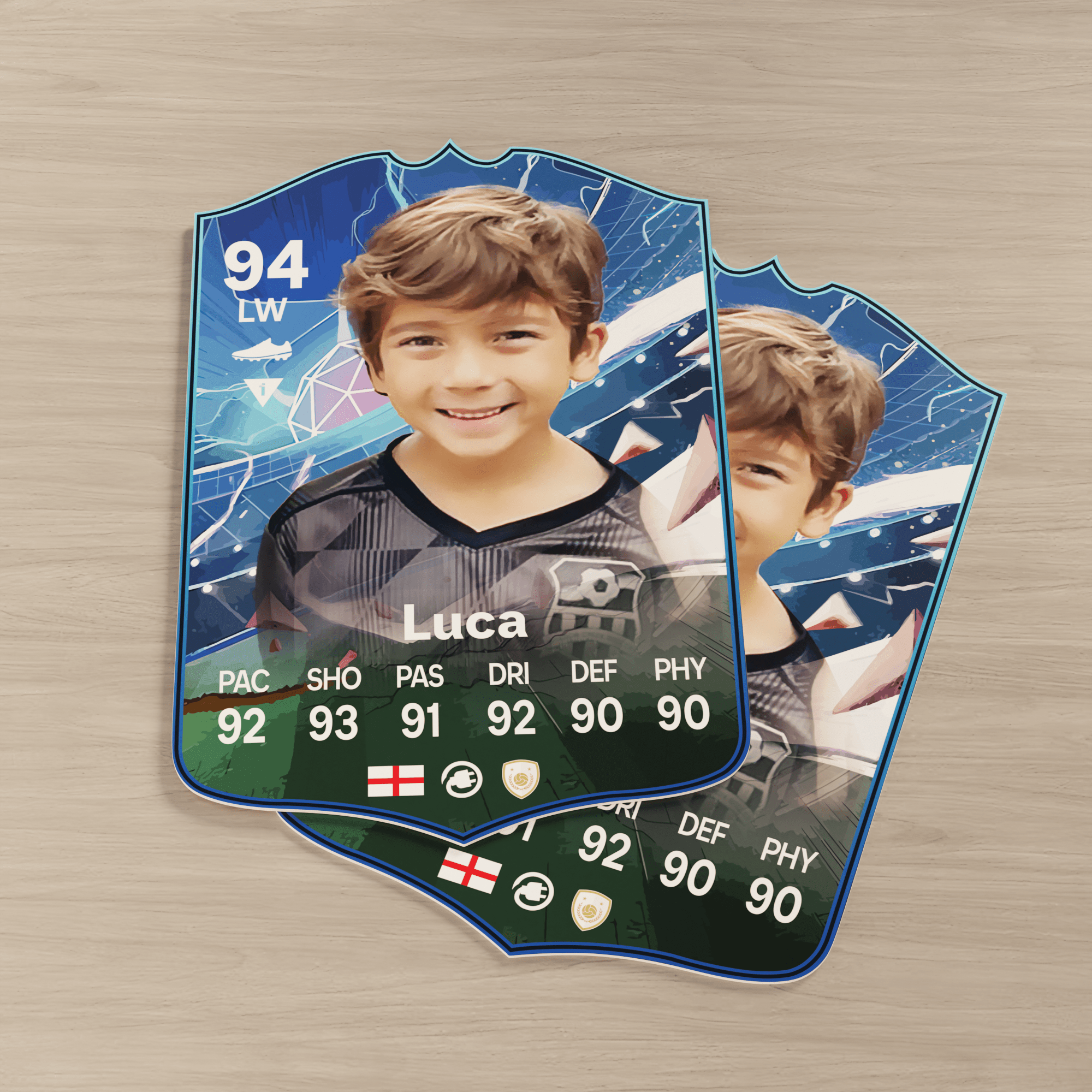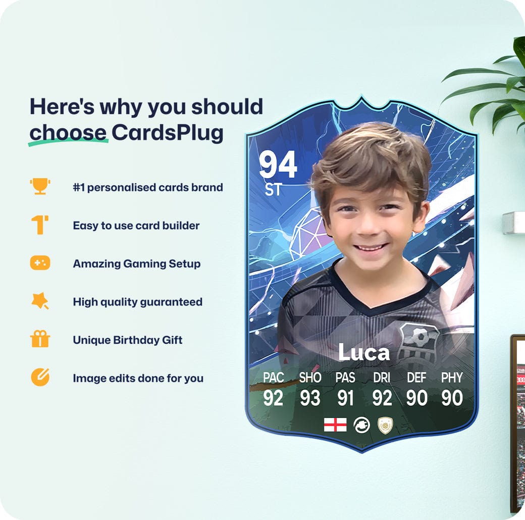 CardsPlug is home to the world’s favourite personalised football cards. Our easy football card builder lets you make a real life football card with your own name, photo, and skill ratings. With 100+ designs to choose from and some inspired by EA SPORTS FC 26 cards seen in EA FC 26, EA FC 25 and FC 24 as well as FIFA cards seen in games like FIFA 23 and FIFA 22.