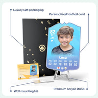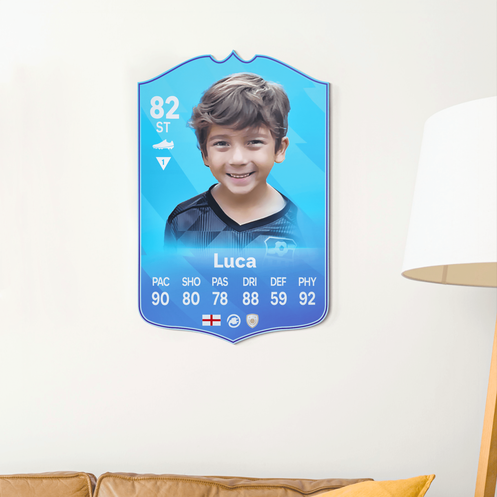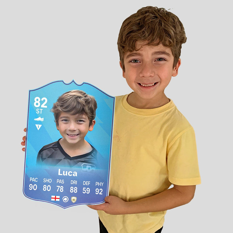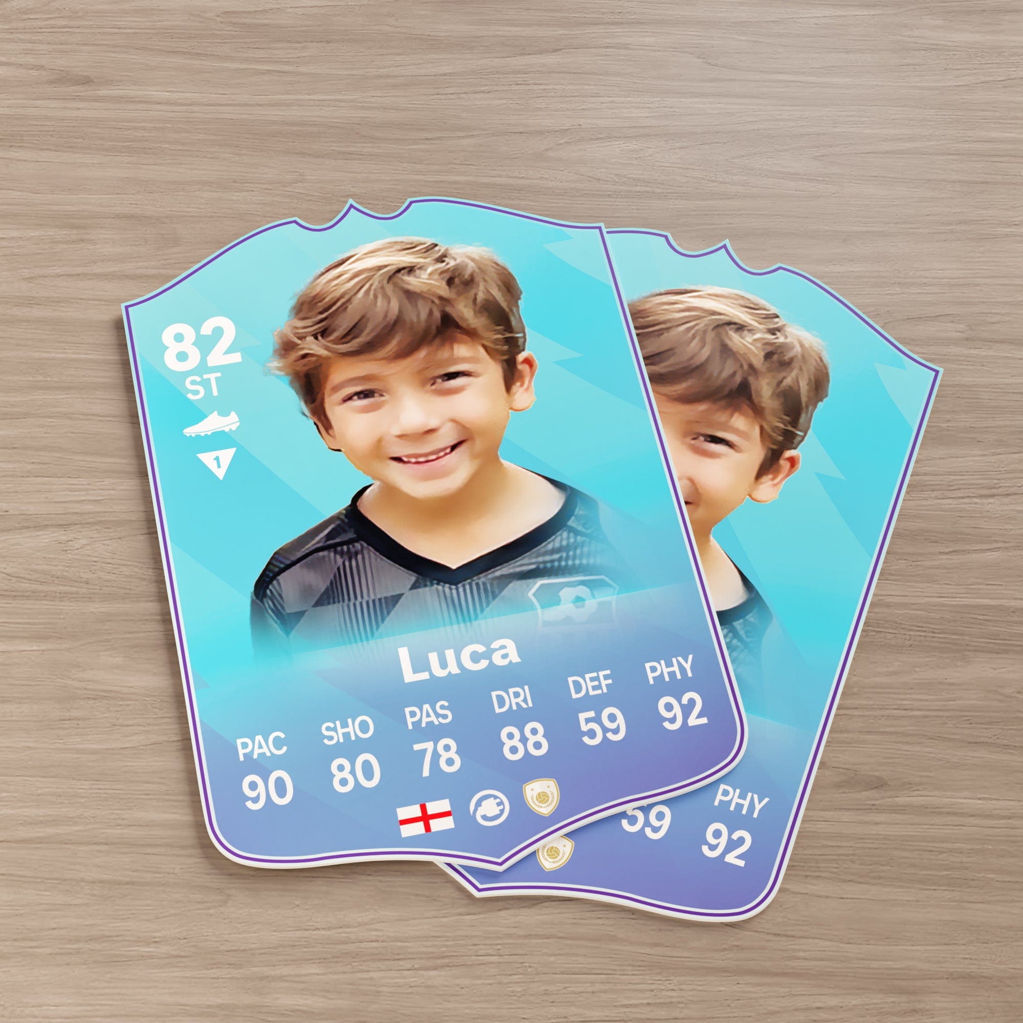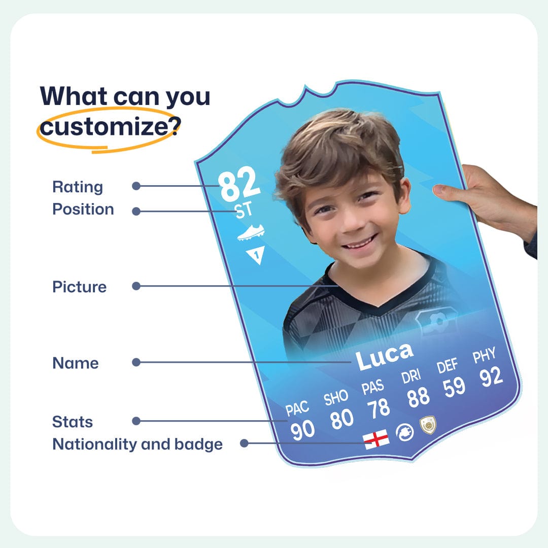 When it comes to personalising your card, the basic steps are to upload a photo and add a name to your card. Then you’ll add details like your player’s position and skill ratings out of 99 for each football skill shown on the card. Our online card builder makes this really easy. And if you aren’t a football card expert, don’t worry!