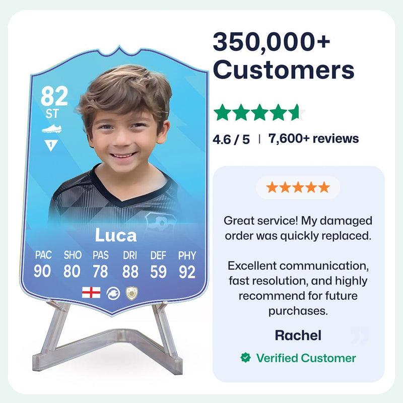 Yes! Our football card designers will remove the background from the photo you upload so it looks just like the football cards you might’ve seen games like EA FC 25, EA FC 24 or FIFA. We’ll also position the photo perfectly on the football card so it looks great. If there are any problems with the quality of your photo, we’ll reach out and let you know. Plus, our website's AI will remove the background on the image for visual purposes before purchase so you can see it without a background on the card.