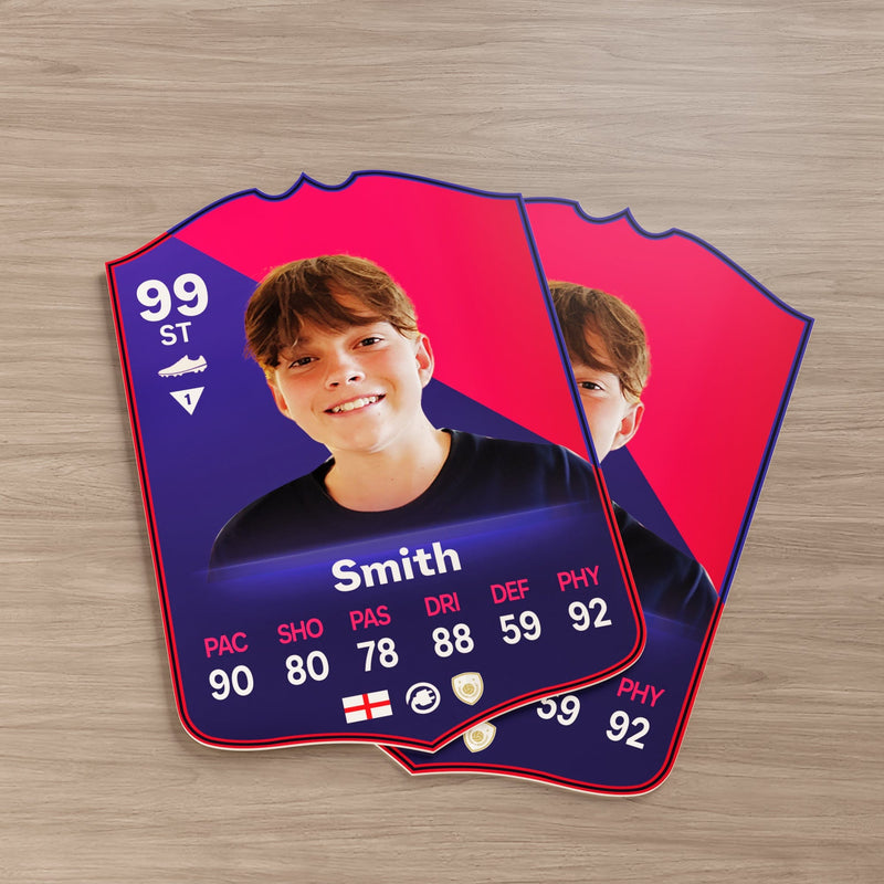 When it comes to personalising your card, the basic steps are to upload a photo and add a name to your card. Then you’ll add details like your player’s position and skill ratings out of 99 for each football skill shown on the card. Our online card builder makes this really easy. And if you aren’t a football card expert, don’t worry!
