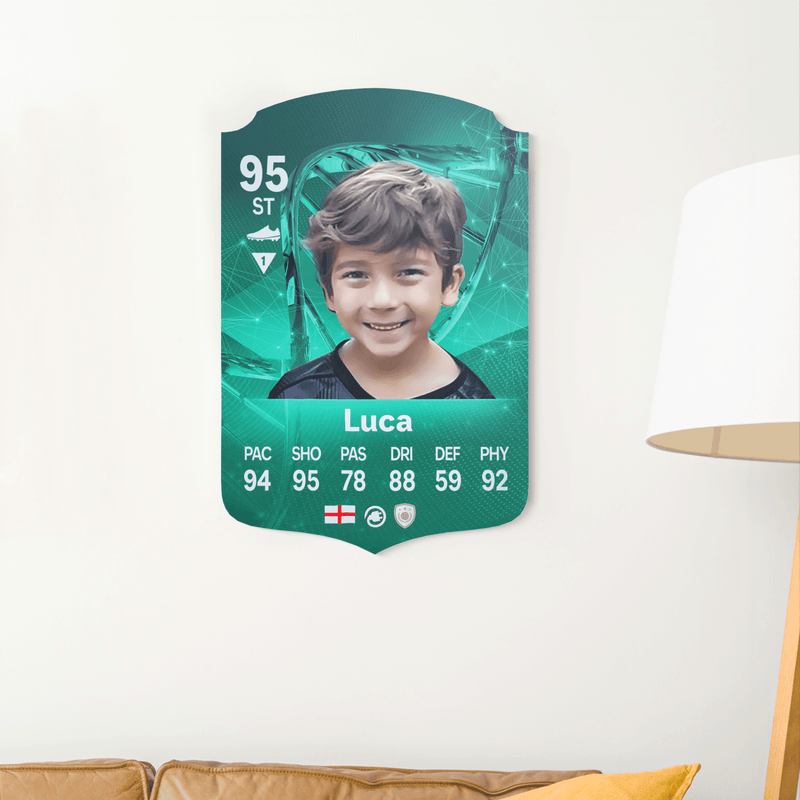 When it comes to personalising your card, the basic steps are to upload a photo and add a name to your card. Then you’ll add details like your player’s position and skill ratings out of 99 for each football skill shown on the card. Our online card builder makes this really easy. And if you aren’t a football card expert, don’t worry!