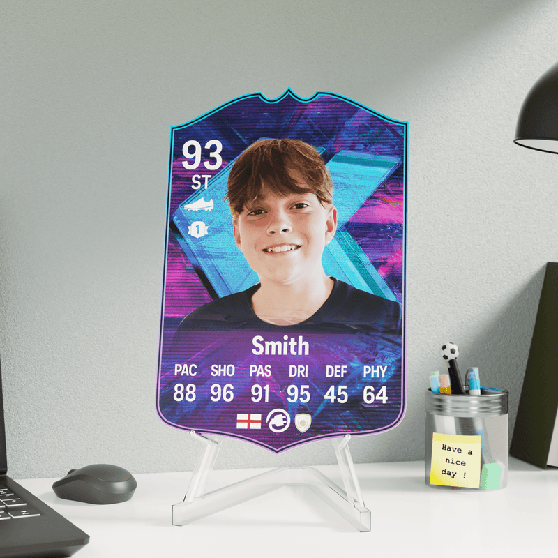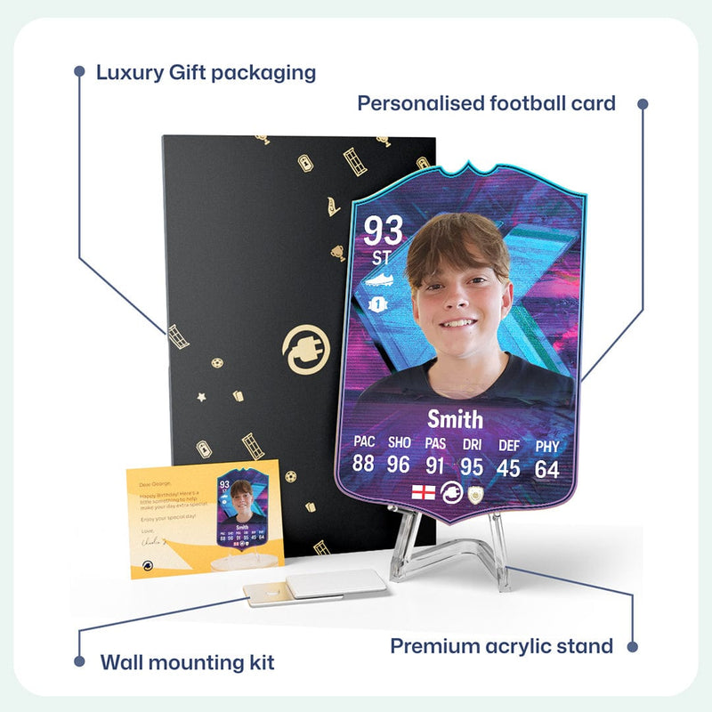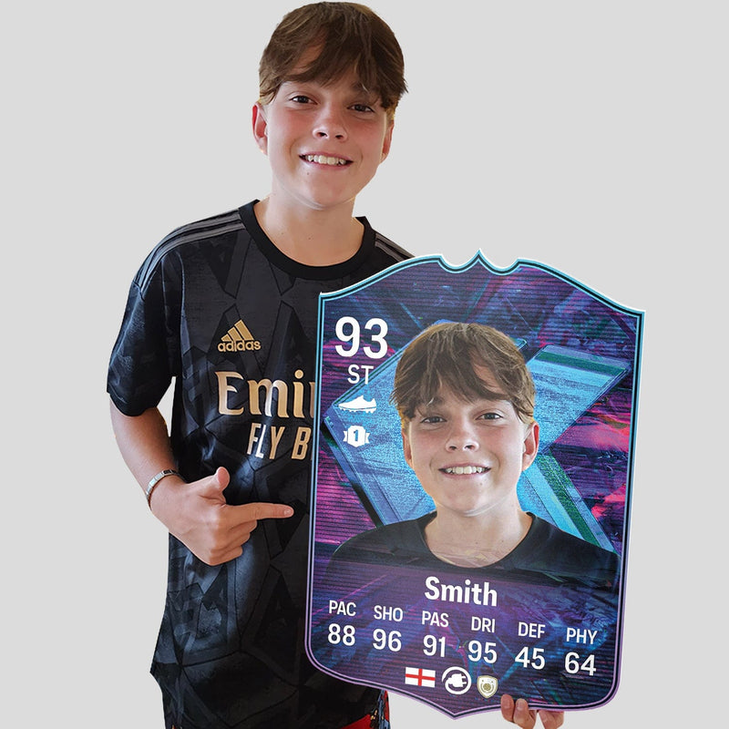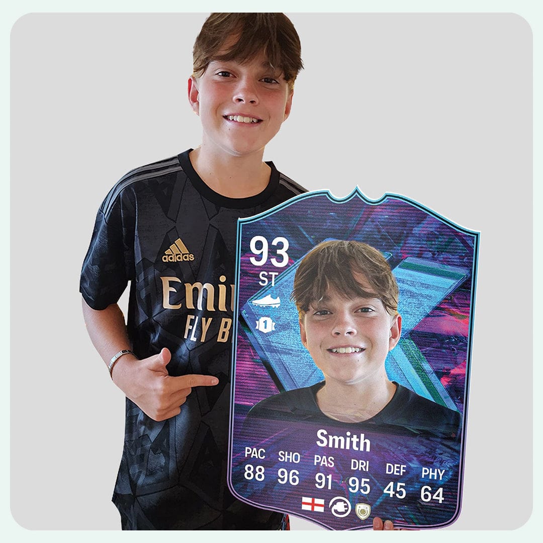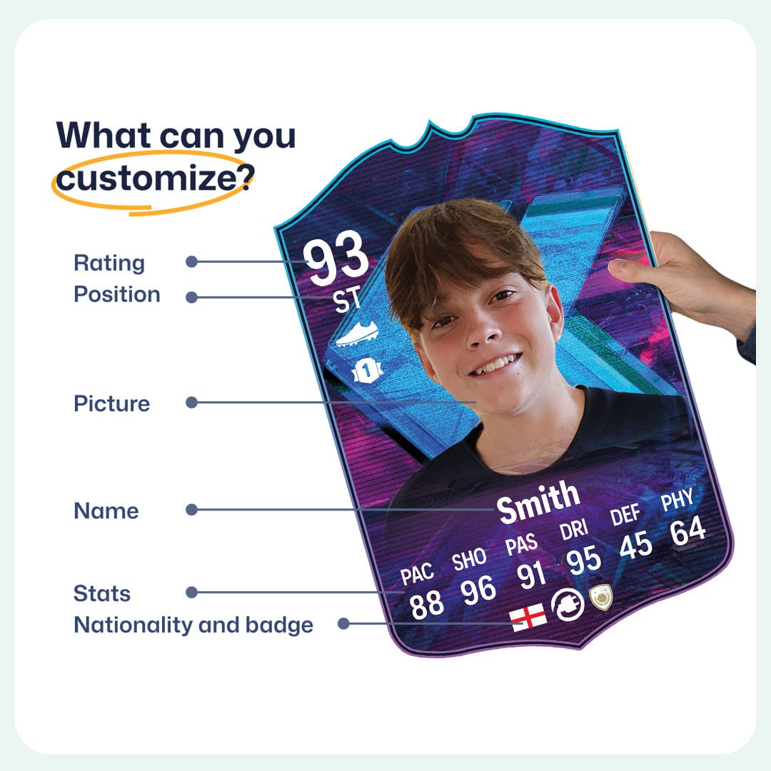 When it comes to personalising your card, the basic steps are to upload a photo and add a name to your card. Then you’ll add details like your player’s position and skill ratings out of 99 for each football skill shown on the card. Our online card builder makes this really easy. And if you aren’t a football card expert, don’t worry!