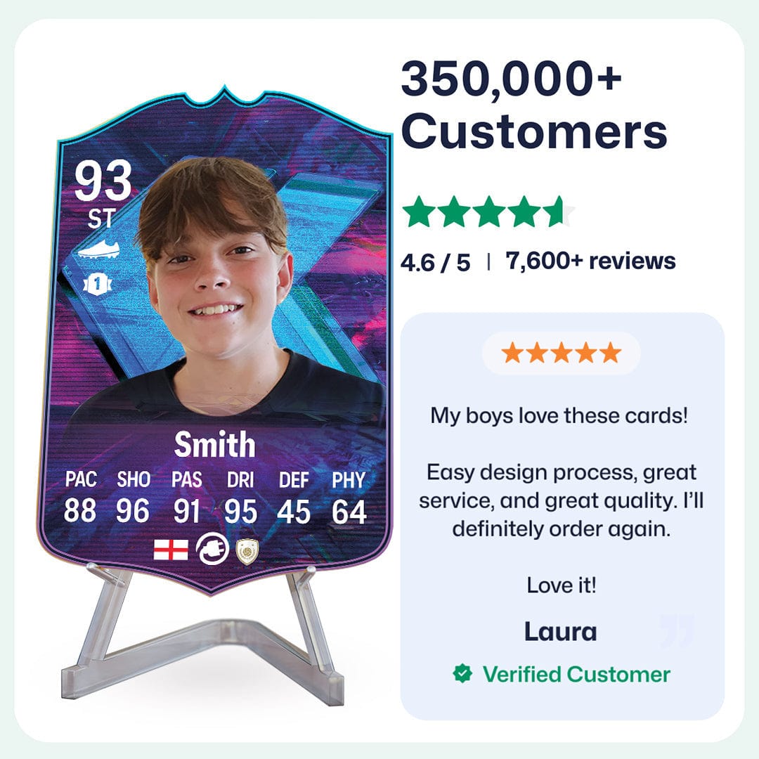 Once you’ve personalised your card, our design experts will edit your photo, design your card, and bring it to life in stunning quality. You’ll get a full preview before we print your card and every card’s quality is backed by our Gold Standard Guarantee. So far, over 350,000+ football fans agree: A CardsPlug football card is the ultimate football gift!