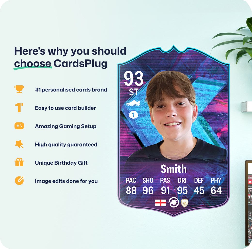 CardsPlug is home to the world’s favourite personalised football cards. Our easy football card builder lets you make a real life football card with your own name, photo, and skill ratings. With 100+ designs to choose from and some inspired by EA SPORTS FC 26 cards seen in EA FC 26, EA FC 25 and FC 24 as well as FIFA cards seen in games like FIFA 23 and FIFA 22.
