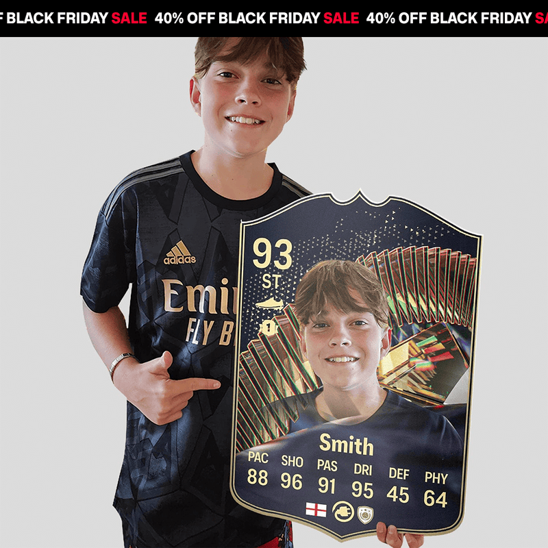 When it comes to personalising your card, the basic steps are to upload a photo and add a name to your card. Then you’ll add details like your player’s position and skill ratings out of 99 for each football skill shown on the card. Our online card builder makes this really easy. And if you aren’t a football card expert, don’t worry!
