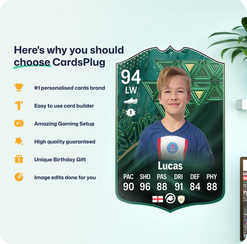 CardsPlug is home to the world’s favourite personalised football cards. Our easy football card builder lets you make a real life football card with your own name, photo, and skill ratings. With 100+ designs to choose from and some inspired by EA SPORTS FC 26 cards seen in EA FC 26, EA FC 25 and FC 24 as well as FIFA cards seen in games like FIFA 23 and FIFA 22.