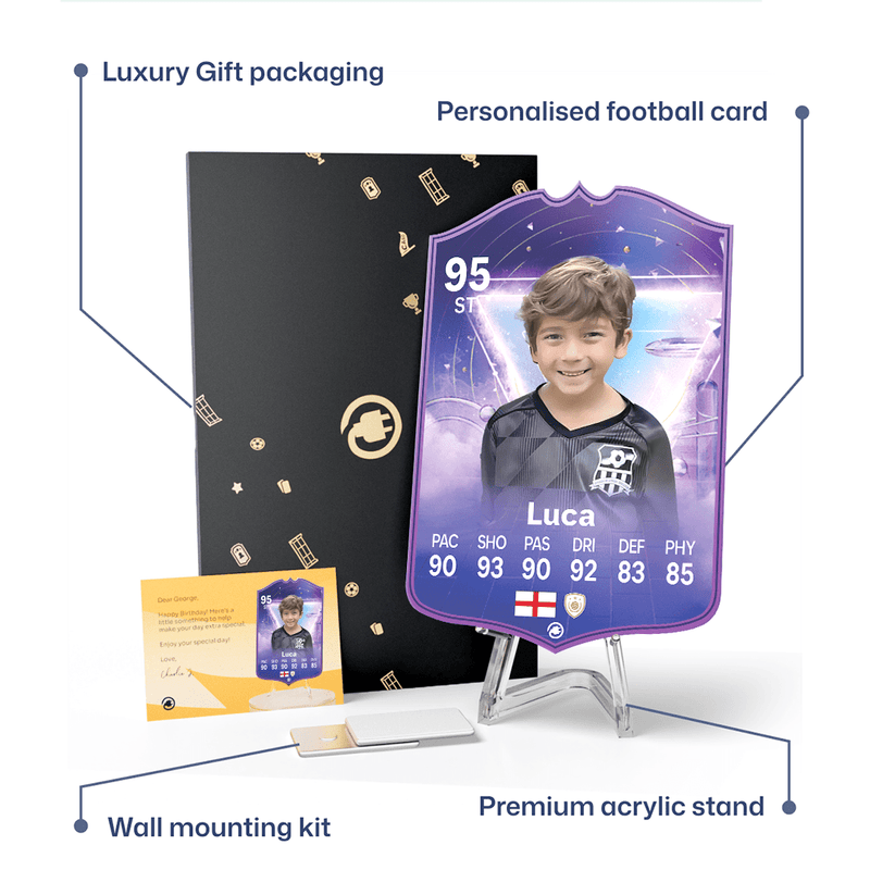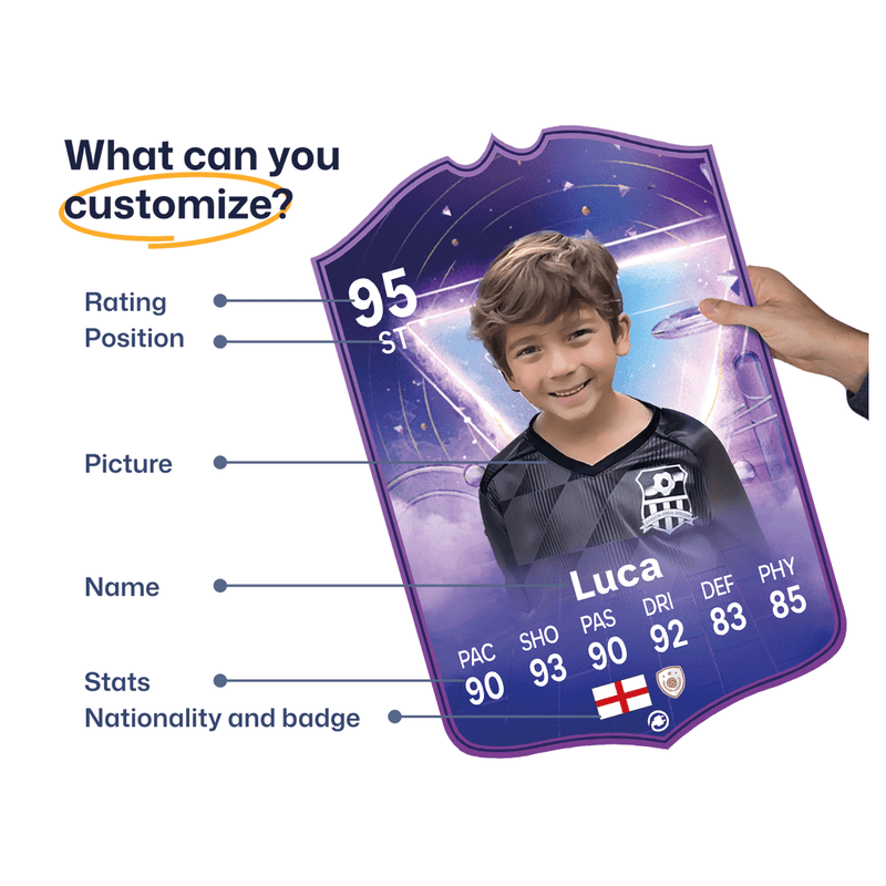 When it comes to personalising your card, the basic steps are to upload a photo and add a name to your card. Then you’ll add details like your player’s position and skill ratings out of 99 for each football skill shown on the card. Our online card builder makes this really easy. And if you aren’t a football card expert, don’t worry!