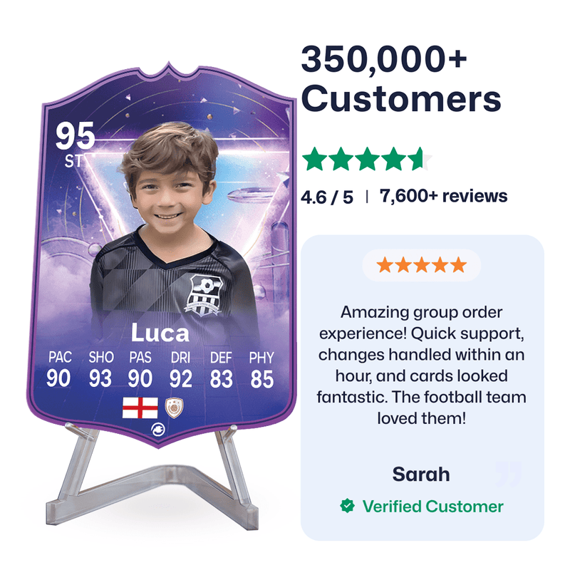 Yes! Our football card designers will remove the background from the photo you upload so it looks just like the football cards you might’ve seen games like EA FC 25, EA FC 24 or FIFA. We’ll also position the photo perfectly on the football card so it looks great. If there are any problems with the quality of your photo, we’ll reach out and let you know. Plus, our website's AI will remove the background on the image for visual purposes before purchase so you can see it without a background on the card.