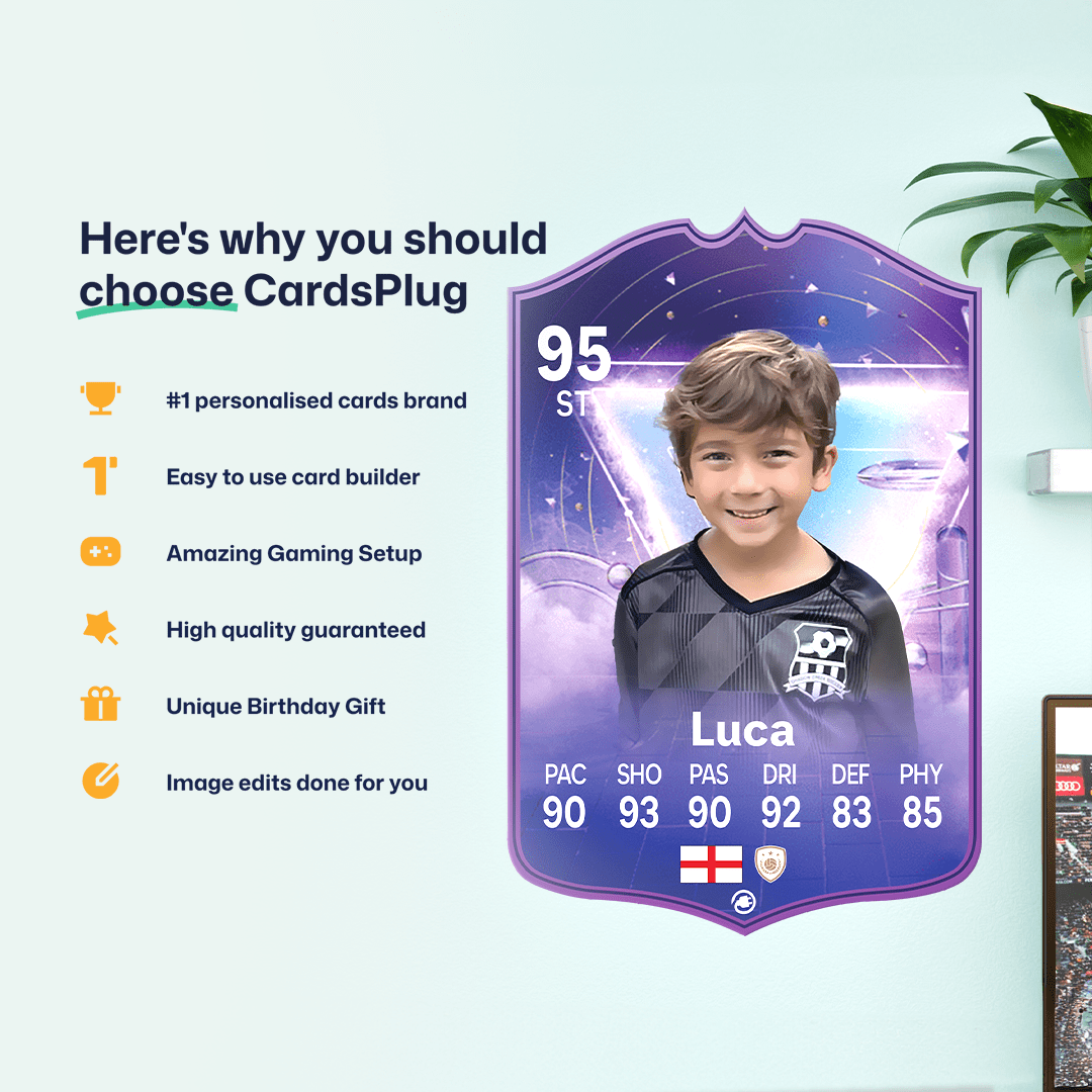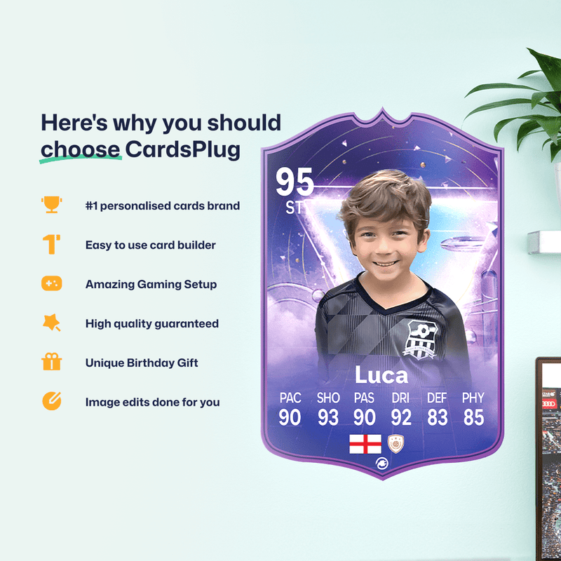 CardsPlug is home to the world’s favourite personalised football cards. Our easy football card builder lets you make a real life football card with your own name, photo, and skill ratings. With 100+ designs to choose from and some inspired by EA SPORTS FC 26 cards seen in EA FC 26, EA FC 25 and FC 24 as well as FIFA cards seen in games like FIFA 23 and FIFA 22.
