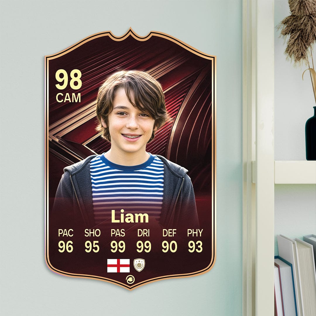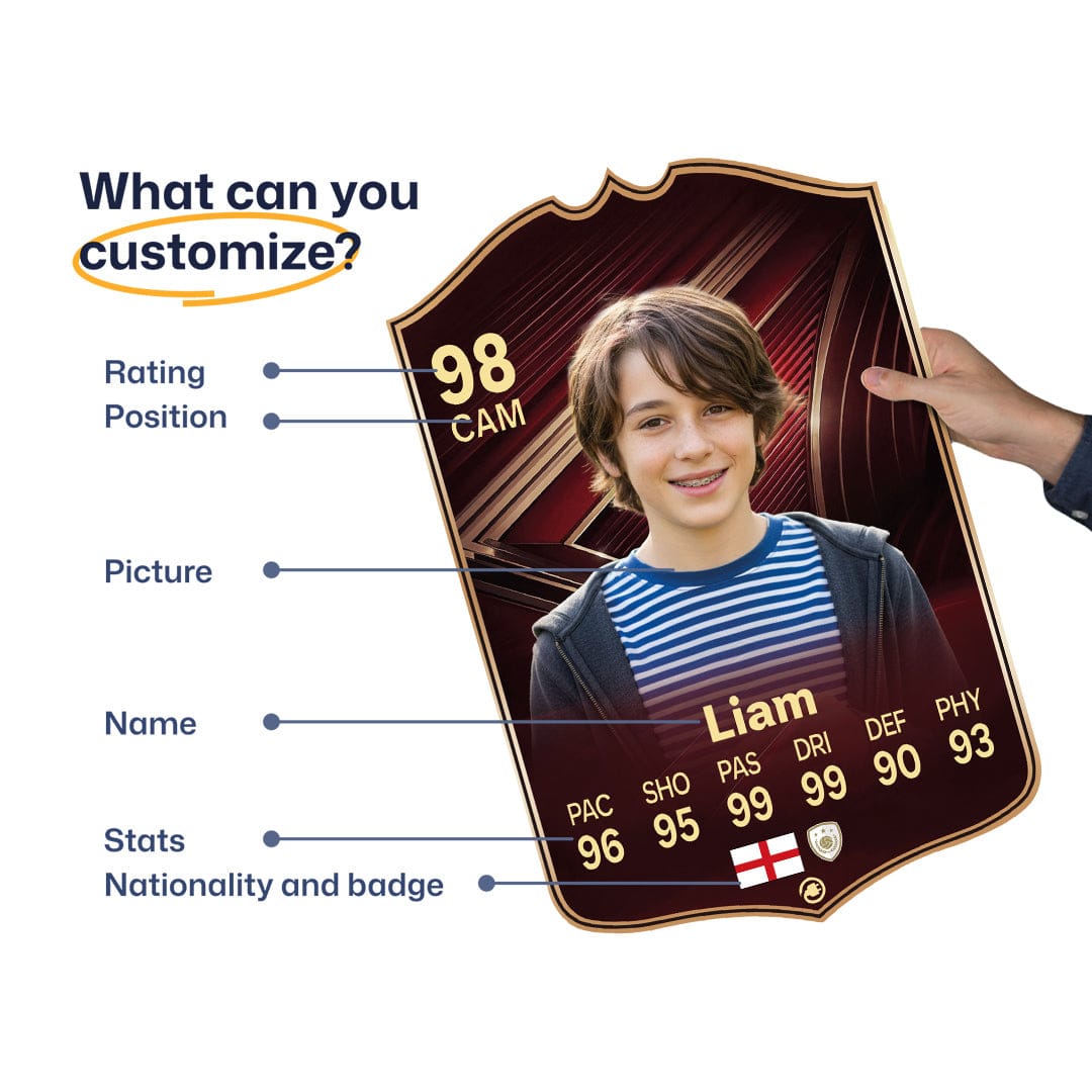When it comes to personalising your card, the basic steps are to upload a photo and add a name to your card. Then you’ll add details like your player’s position and skill ratings out of 99 for each football skill shown on the card. Our online card builder makes this really easy. And if you aren’t a football card expert, don’t worry!