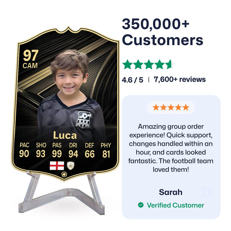 Once you’ve personalised your card, our design experts will edit your photo, design your card, and bring it to life in stunning quality. You’ll get a full preview before we print your card and every card’s quality is backed by our Gold Standard Guarantee. So far, over 350,000+ football fans agree: A CardsPlug football card is the ultimate football gift!