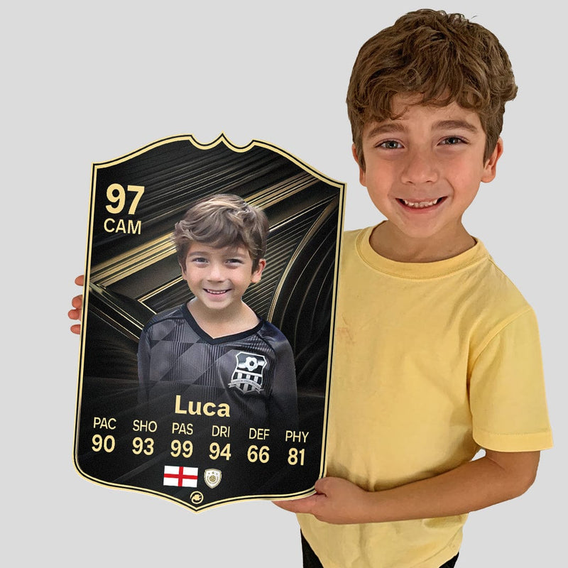 When it comes to personalising your card, the basic steps are to upload a photo and add a name to your card. Then you’ll add details like your player’s position and skill ratings out of 99 for each football skill shown on the card. Our online card builder makes this really easy. And if you aren’t a football card expert, don’t worry!