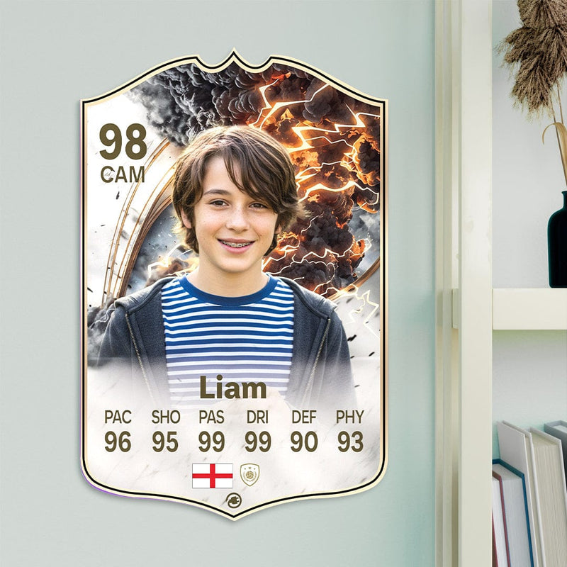 When it comes to personalising your card, the basic steps are to upload a photo and add a name to your card. Then you’ll add details like your player’s position and skill ratings out of 99 for each football skill shown on the card. Our online card builder makes this really easy. And if you aren’t a football card expert, don’t worry!