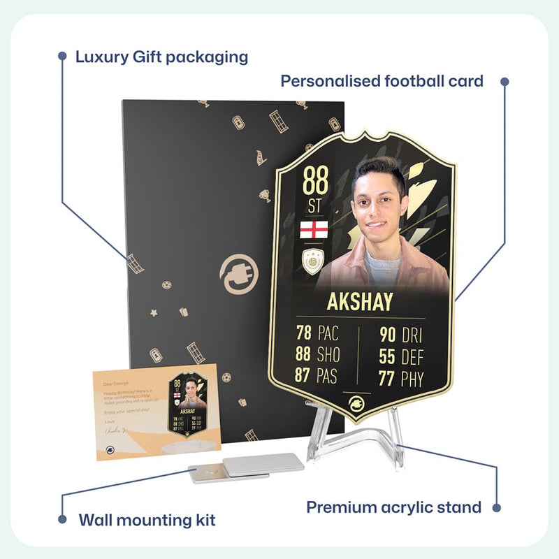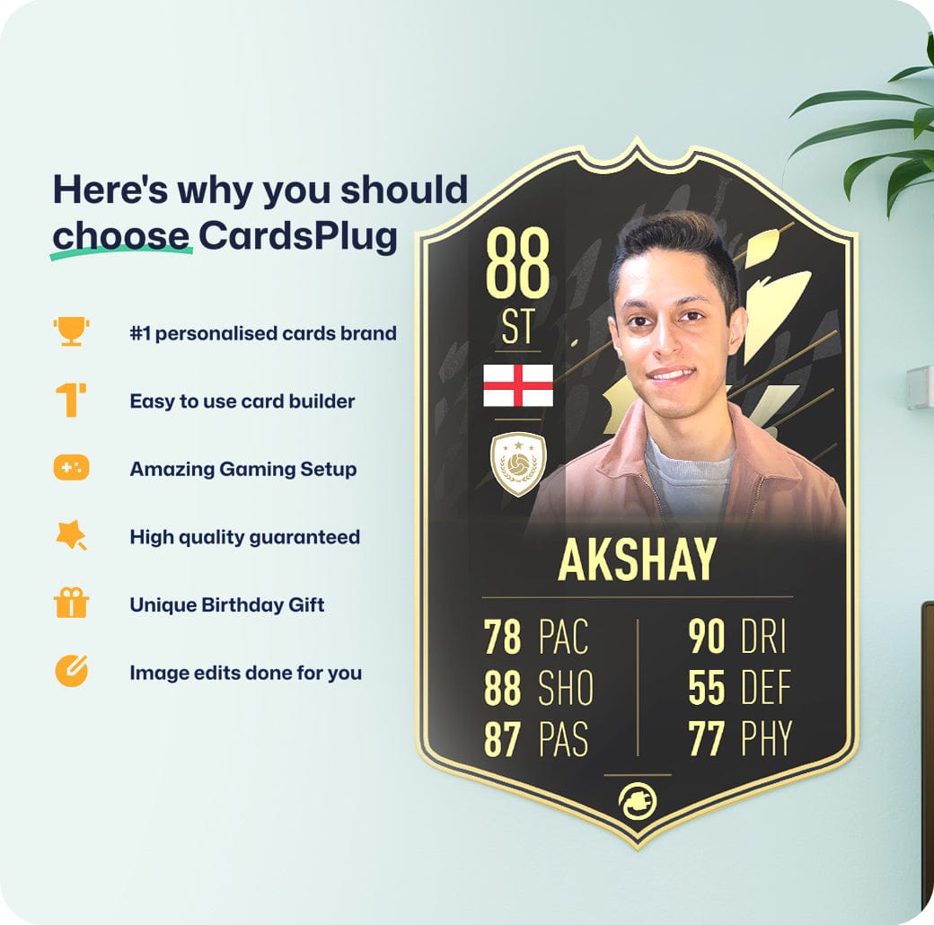 CardsPlug is home to the world’s favourite personalised football cards. Our easy football card builder lets you make a real life football card with your own name, photo, and skill ratings. With 100+ designs to choose from and some inspired by EA SPORTS FC 26 cards seen in EA FC 26, EA FC 25 and FC 24 as well as FIFA cards seen in games like FIFA 23 and FIFA 22.