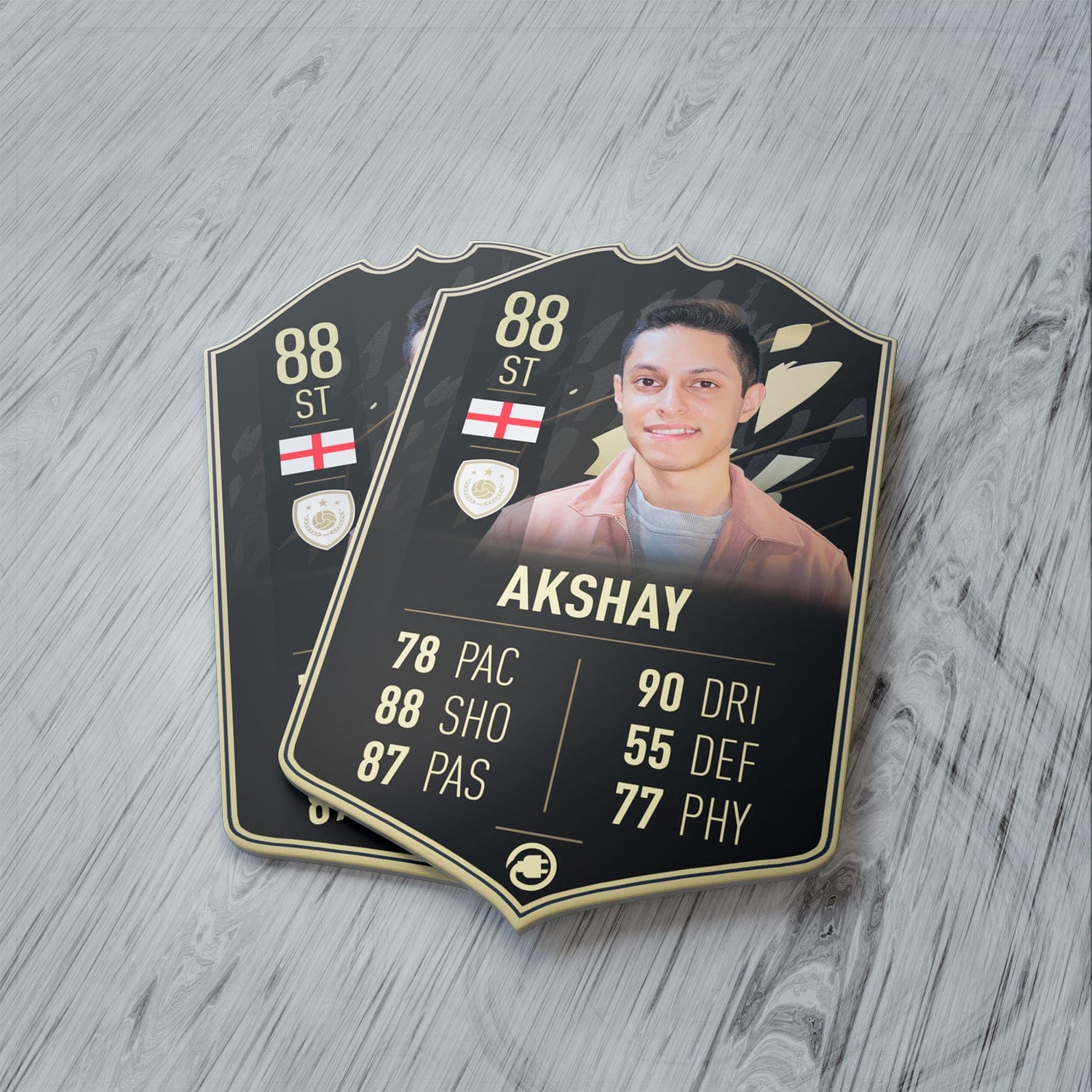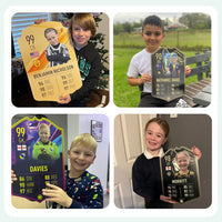 Our football card builder lets you choose between two different card materials. Our Standard cards are made of a ultra-strong variety of Foamex (not cardboard or foam!). This material has a lovely gloss finish and is also super durable. Our world-exclusive Metal football cards have a matte finish and are slightly heavier. Both look amazing and will last forever.