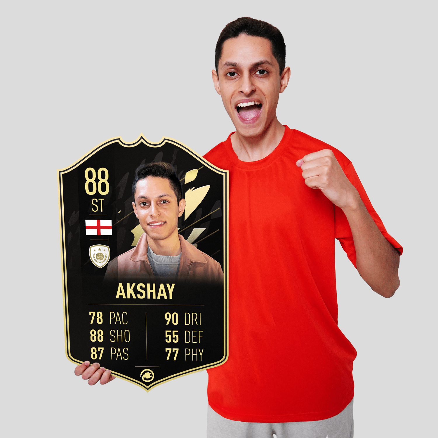 When it comes to personalising your card, the basic steps are to upload a photo and add a name to your card. Then you’ll add details like your player’s position and skill ratings out of 99 for each football skill shown on the card. Our online card builder makes this really easy. And if you aren’t a football card expert, don’t worry!